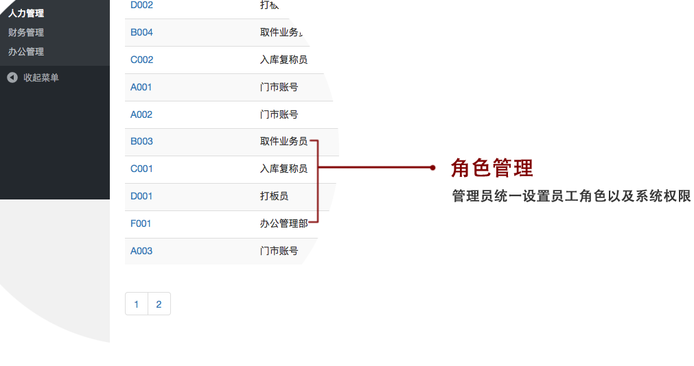 管理员可以统一设置及管理公司内部员工每个角色在这物流系统权限,如取件员,入库员,打板员,财务员,客服等