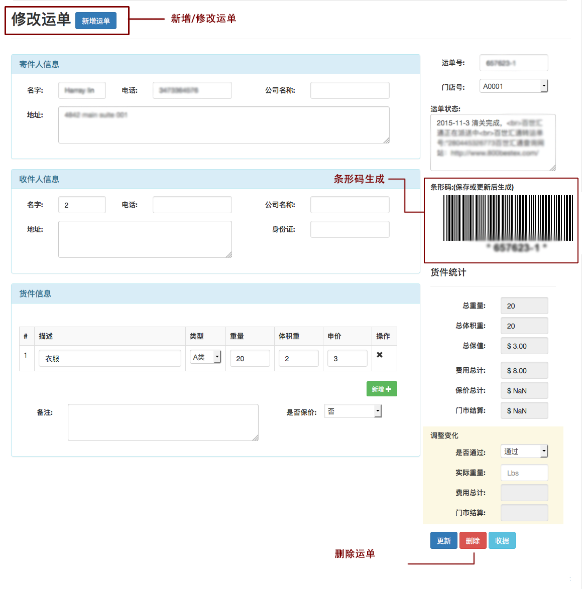 - 新增运单,修改运单,删除运单,运单包含有寄件人与收件人信息,货物物品的登记及计算